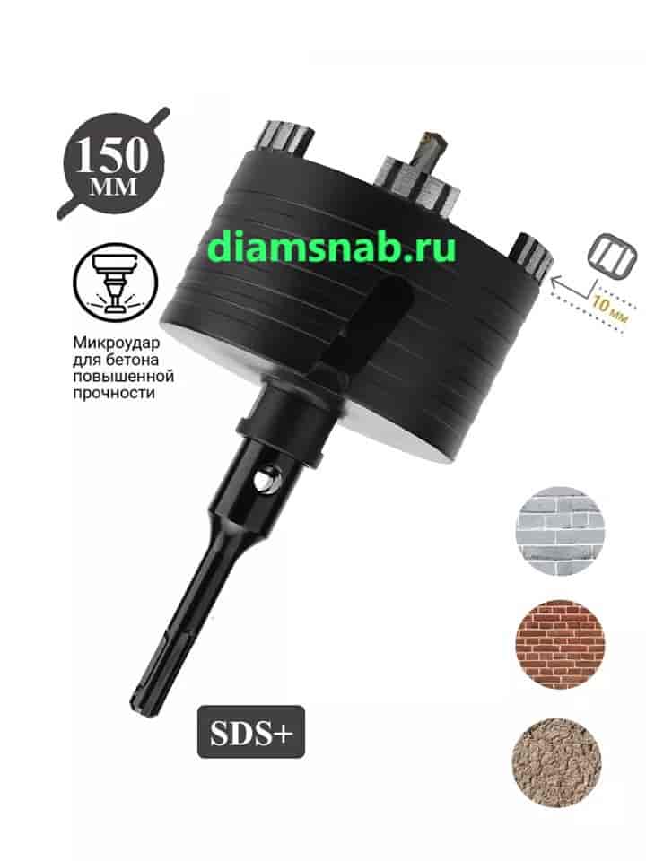 Алмазная безударная коронка для перфоратора SDS-Plus 150 мм имеет стальной корпус цилиндрической формы с напаянными алмазными сегментами в режущей части. Поставляется в сборе с острым центровочным твердосплавным сверлом, наделенным переходником с М16 на SDS-plus. Алмазная коронка по керамограниту 150мм предназначена для безударного сверления твердых материалов без использования охлаждающей жидкости, таких как железобетон, армированный бетон, керамогранит, кирпич, клинкер, шамот, бордюрный камень, на выходе получаем ровное отверстие без сколов со строго выдержанным размером благодаря безударному сверлению и точно в намеченном месте благодаря наличию центрирующего твердосплавного сверла. Алмазная коронка по железобетону 150 мм рекомендуется для выполнения глухих и сквозных отверстий в кирпиче, бетоне (в том числе и армированном), керамограните и железобетоне. Имеет высокую производительность и высокую скорость сверления, а самое главное можно работать "на сухую" - без применения охлаждающей жидкости, что нашло самое широкое применение не только в гражданском, но и промышленном строительстве. Внимание, имеется возможность приобрести удлинители для алмазных коронок по бетону на перфоратор М16 / sds plus и М16 / sds max длиной 400 600 800 1000 мм в сборе с центровочным сверлом, что является большим подспорьем при работе в труднодоступных местах и там где глубины коронки просто не хватает, подходят для перфораторов SDS PLUS и SDS MAX, что также является немаловажным.