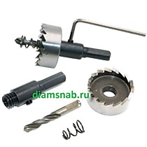 Купить оптом и в розницу по низким ценам в Москве качественную цилиндрическую коронку по металлу HSS 22 мм с шестигранником и центрирующим сверлом. Такая универсальная коронка 22,0 мм из быстрорежущей стали используется не только по цветным и черным металлам, но и по чугунам, алюминию, меди, латуни и другим металлам и сплавам на их основе, а благодаря наличию высоколегирующих металлов в составе зубьев коронок стало возможным применение быстрорежущих коронок 22 мм по нержавеющей стали, так же такие быстрорежущие кольцевые пилы 22мм нашли широкое применение по дереву и материалам на основе древесины, таким как фанера, древесные плиты, ДСП, ДВП, а так же по гипсокартону, пластикам и полимерам и другим современным композитным материалам, например по сендвич-панелям, оконным профилям, биметаллическим трубам и другим изделиям имеющим в своей основе несколько материалов различной твердости. Корпус и зубья HSS-коронки по металлу с центрующим сверлом 22 мм выполнен из быстрорежущей стали для повышения износостойкости и других эксплуатационных свойств кольцевых пил по металлу 22мм. В комплект каждой коронки по металлу HSS 22 мм входят - сама коронка 22 мм с шестигранным хвостовиком для дрели и сверлильного станка, сверло и шестигранный имбусовый ключ, который фиксирует направляющее сверло в коронке по металлу 22 мм. Аналогом, причем недорогим, могут выступить Биметаллические коронки по металлу HSS BiM ( кольцевые пилы по металлу), ассортимент которых по диаметрам гораздо выше и глубина сверления больше.